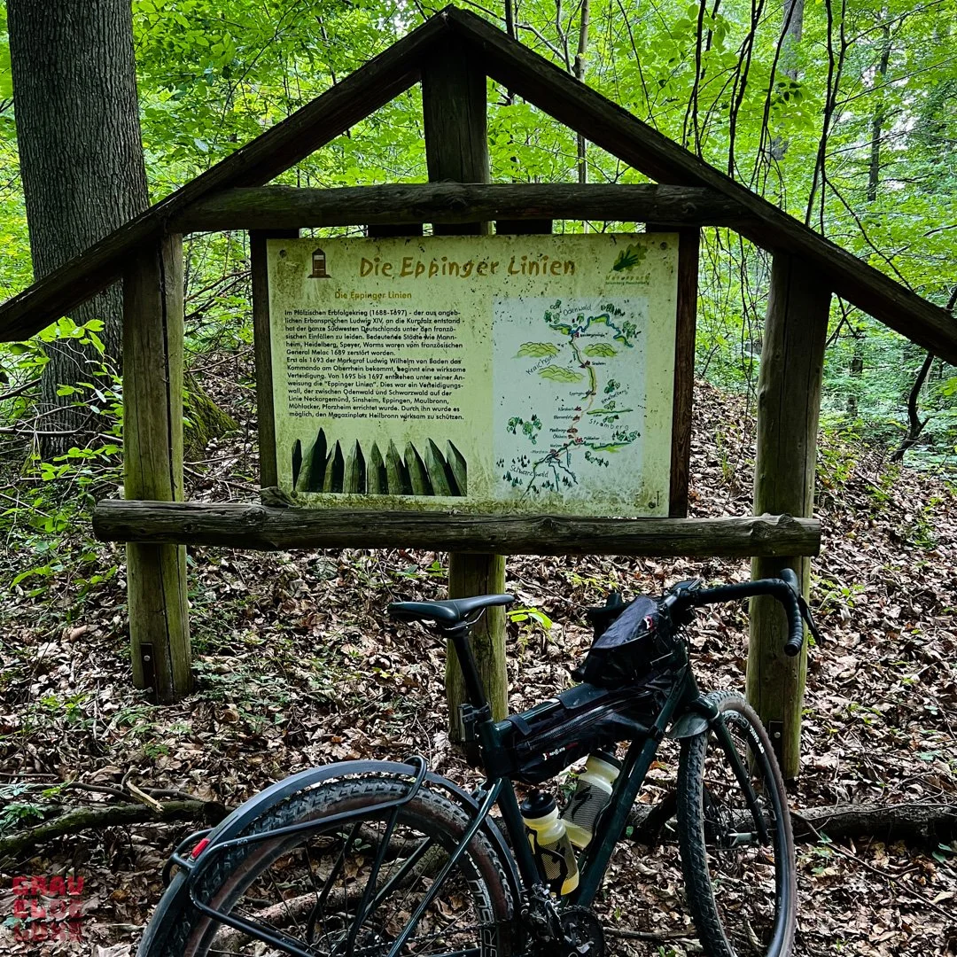 Wir jetzt den Eppinger Linien entlang -- zuerst mit einem Abstecher zu Resten der Anlage im Wald und dann nachdem wir die Grenze nach Baden erreicht haben geht es auf Trails entlang der Linien weiter. Der Graben neben dem Trail war Teil der Befestigungsanlage ... Wow.